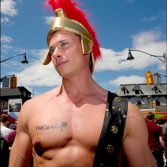Although trained as a Thracian, Caladus never wore any of the traditional armor of a Greek. To the delight of the women spectators, and many of the men too, Caladus chose vanity over armor and preferred to fight wearing only a short tunic around his waist and a visored helmet on his head. His impressively muscled body was fully exposed as he fought. Both women and men would swoon as Caladus’ smooth muscular torso glistened in the afternoon sun as he wielded his sword in battle.